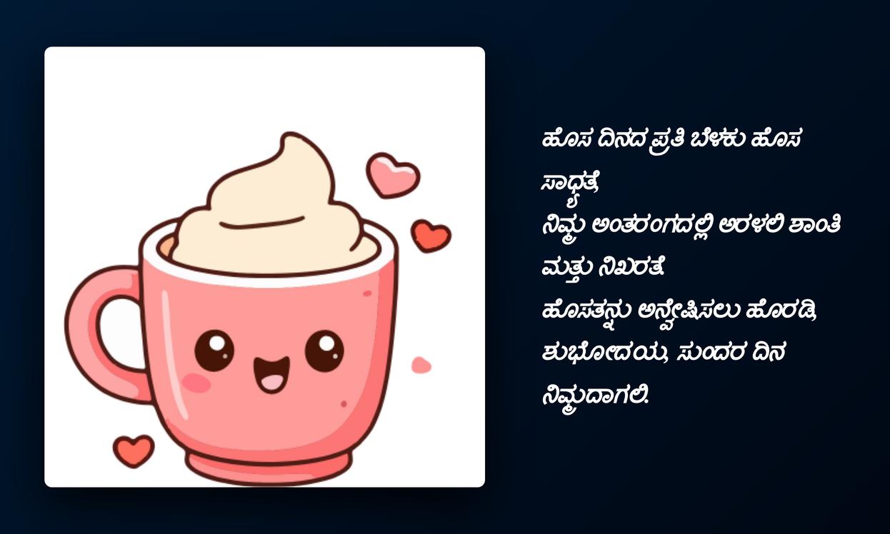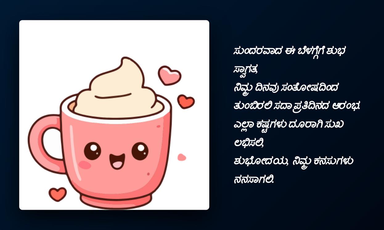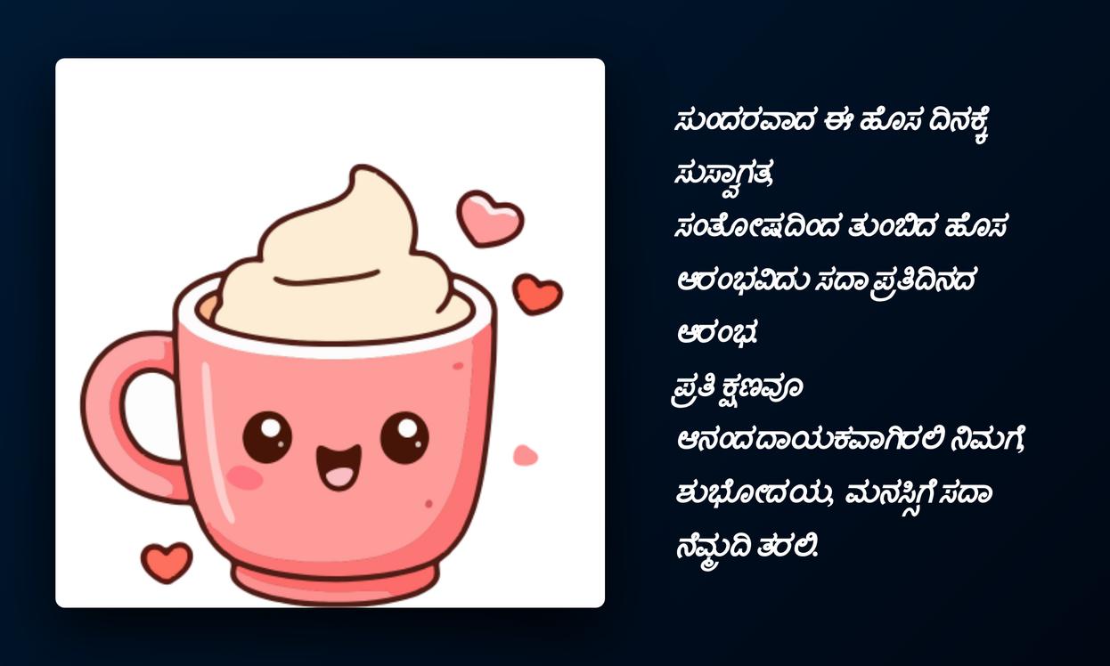 good morning quotes in kannada:చివరగా, రోజును మంచిగా ప్రారంభించే శక్తిని Good Morning quotes కలిగి ఉంటాయి. ఇవి కేవలం పదాలు మాత్రమే కావు, ఇతరుల పట్ల మనకున్న ప్రేమను, శ్రద్ధను తెలియజేసే శక్తివంతమైన మాధ్యమాలు. కన్నడలో ఈ quotes పంపడం ద్వారా మీ స్థానిక భాషను గౌరవిస్తూనే, మీ ప్రియమైన వారితో లోతైన భావోద్వేగ బంధాన్ని పెంచుకోవచ్చు. ఇది మీ social media profileకు ప్రత్యేకతను తీసుకువస్తుంది, మీ భావోద్వేగాలను వ్యక్తీకరించడానికి ఒక వేదికను అందిస్తుంది.