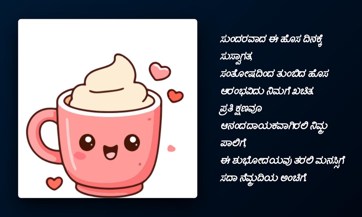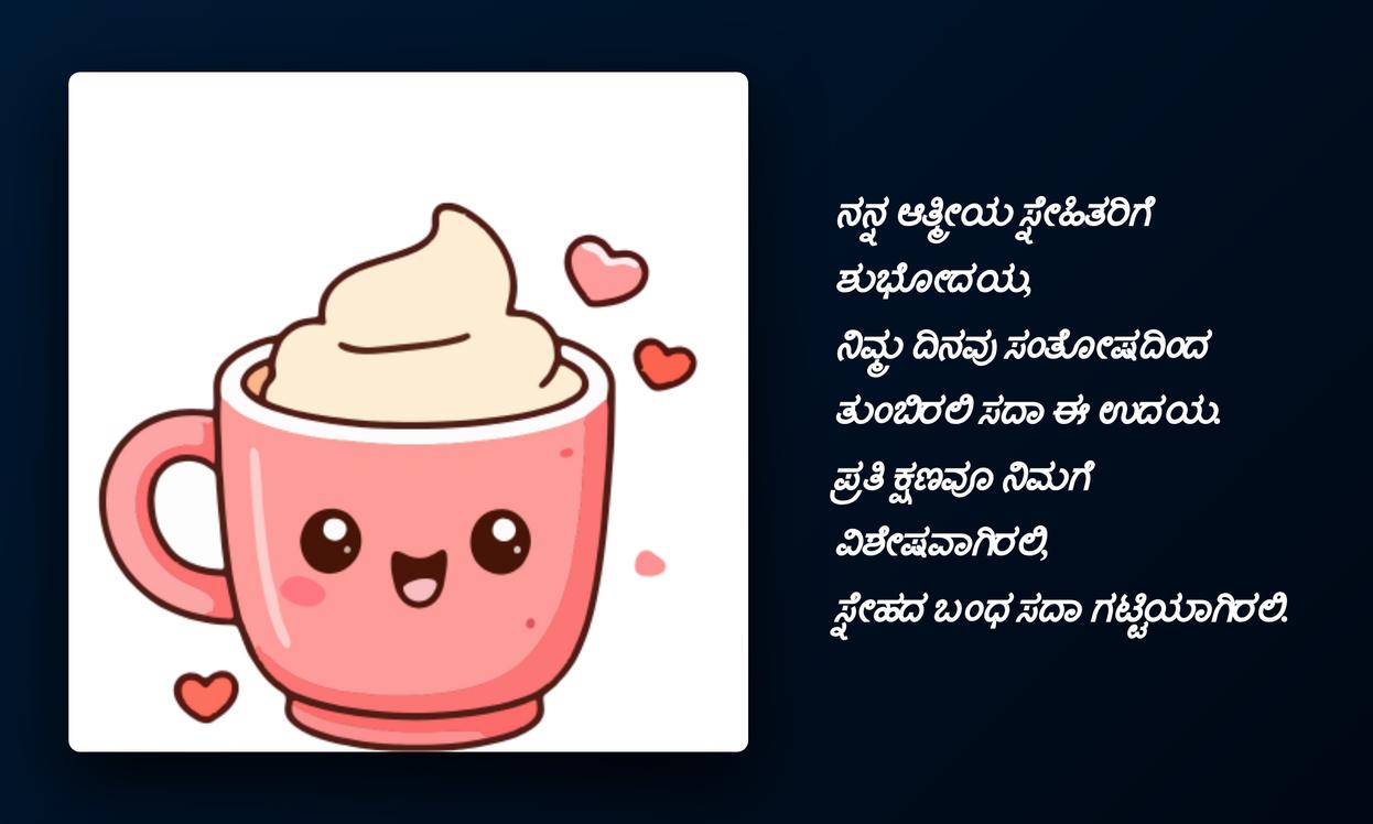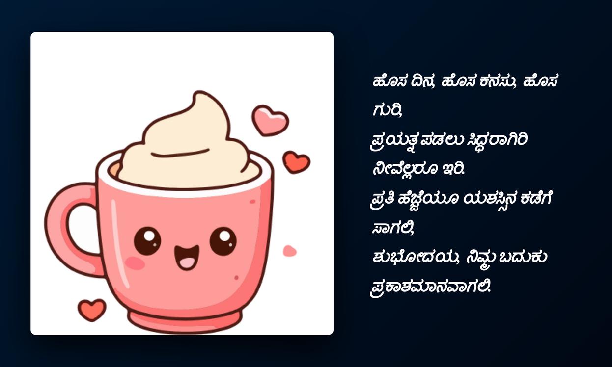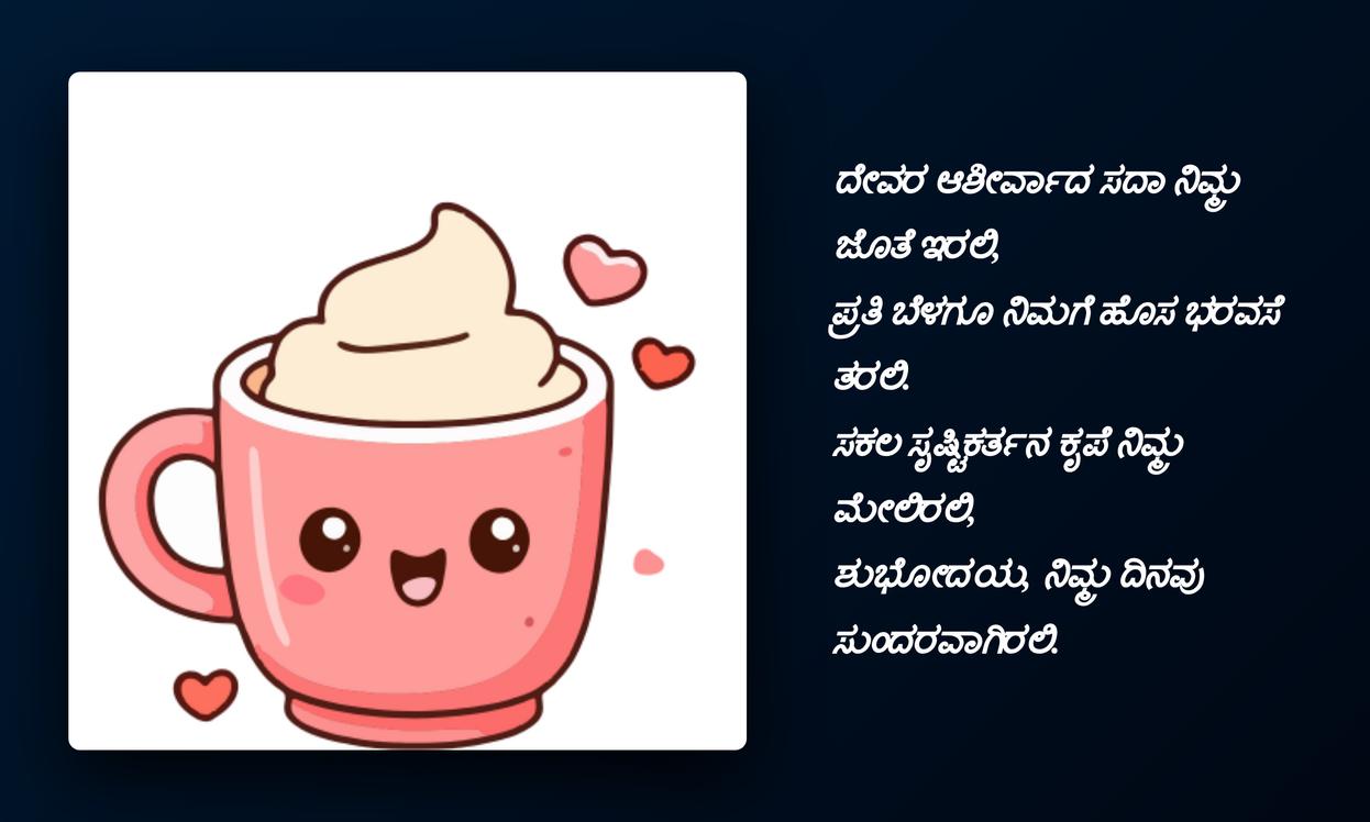 good morning quotes in kannada:చివరగా, రోజును మంచిగా ప్రారంభించే శక్తిని Good Morning quotes కలిగి ఉంటాయి. ఇవి కేవలం పదాలు మాత్రమే కావు, ఇతరుల పట్ల మనకున్న ప్రేమను, శ్రద్ధను తెలియజేసే శక్తివంతమైన మాధ్యమాలు. కన్నడలో ఈ quotes పంపడం ద్వారా మీ స్థానిక భాషను గౌరవిస్తూనే, మీ ప్రియమైన వారితో లోతైన భావోద్వేగ బంధాన్ని పెంచుకోవచ్చు. ఇది మీ social media profileకు ప్రత్యేకతను తీసుకువస్తుంది, మీ భావోద్వేగాలను వ్యక్తీకరించడానికి ఒక వేదికను అందిస్తుంది.