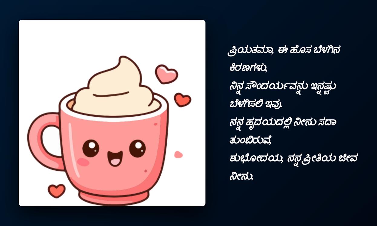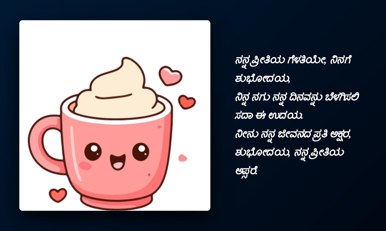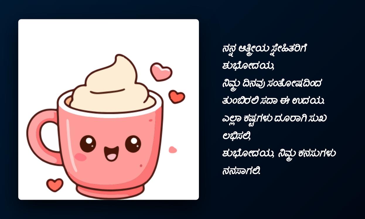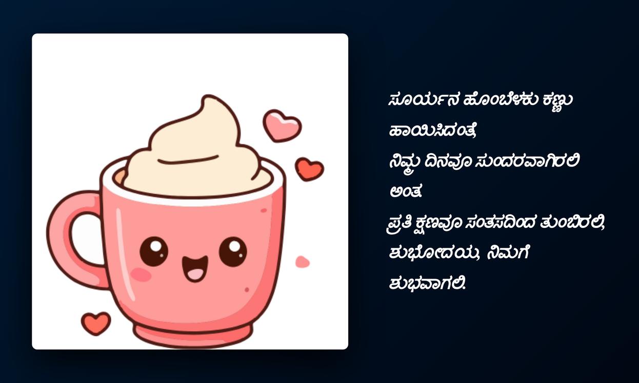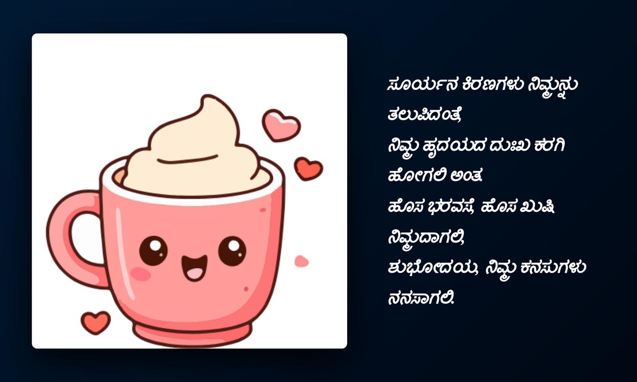 ಶುಭೋದಯದ ಶುಭ ಹಾರೈಕೆಗಳನ್ನು ನಿಮಗೆ ಕಳುಹಿಸುವೆ.