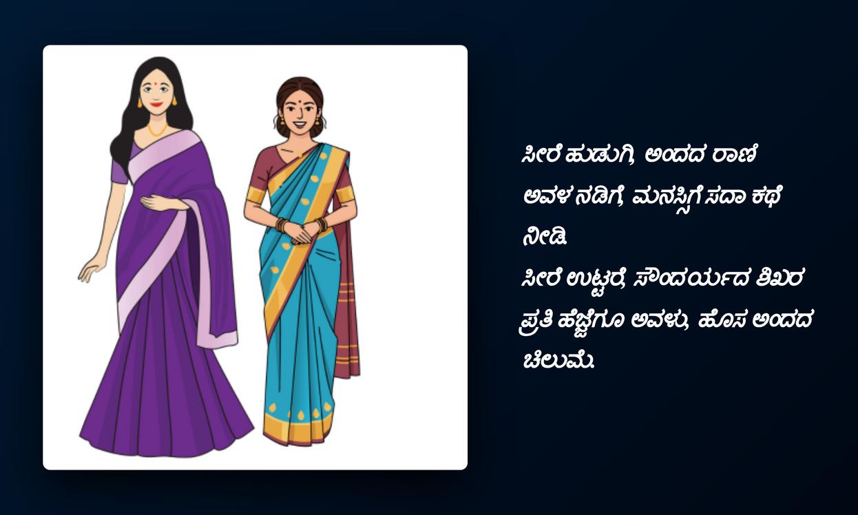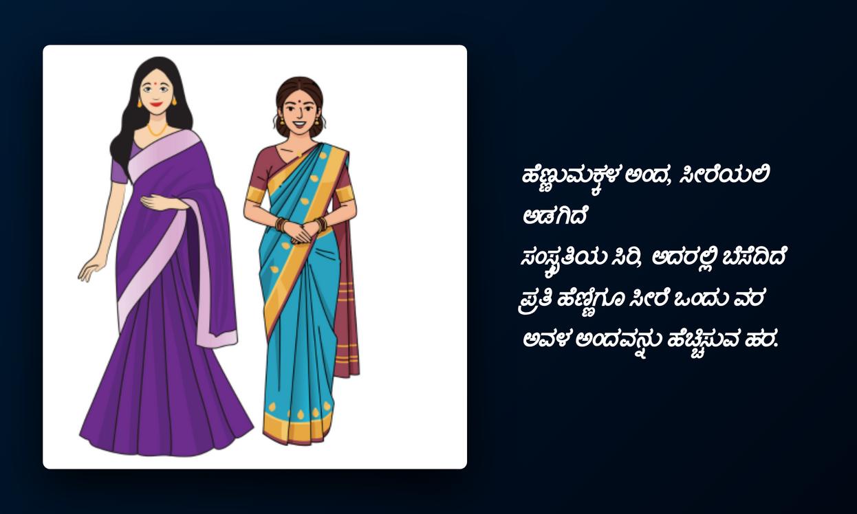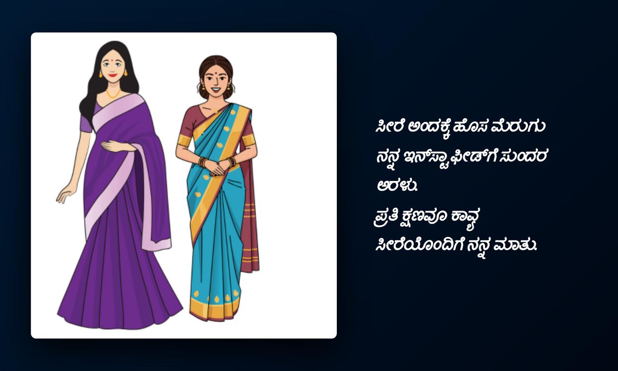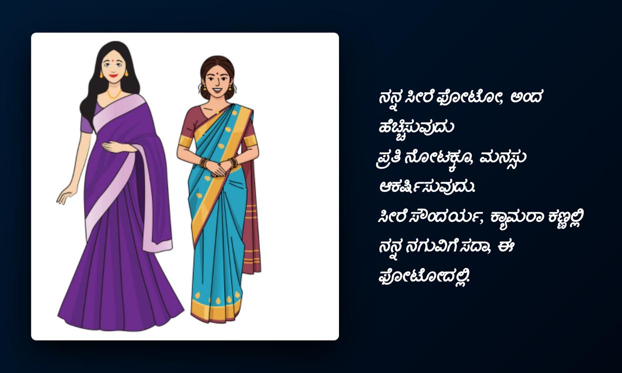 వాస్తవానికి, మనం ధరించే చీర మన మనోభావాలను, మన శైలిని, మన attitudeను ప్రతిబింబిస్తుంది. దానికి తోడు కన్నడ భాషలో ఒక హృదయాన్ని తాకే కోట్ జతచేస్తే, అది మీ social media identityని మరింత పటిష్టం చేస్తుంది. ఇది మీ cultural roots పట్ల మీకున్న గౌరవాన్ని, అభిమానాన్ని చూపిస్తుంది. ఈ కోట్స్ కేవలం కొన్ని పదాలు మాత్రమే కాదు, అవి మీ భావోద్వేగాలను, ఆత్మవిశ్వాసాన్ని వ్యక్తపరిచే శక్తివంతమైన సాధనాలు. మీ ప్రొఫైల్కు ప్రత్యేకతను తీసుకురావడానికి ఇవి ఎంతో సహాయపడతాయి, అందరి దృష్టిని ఆకర్షిస్తాయి.