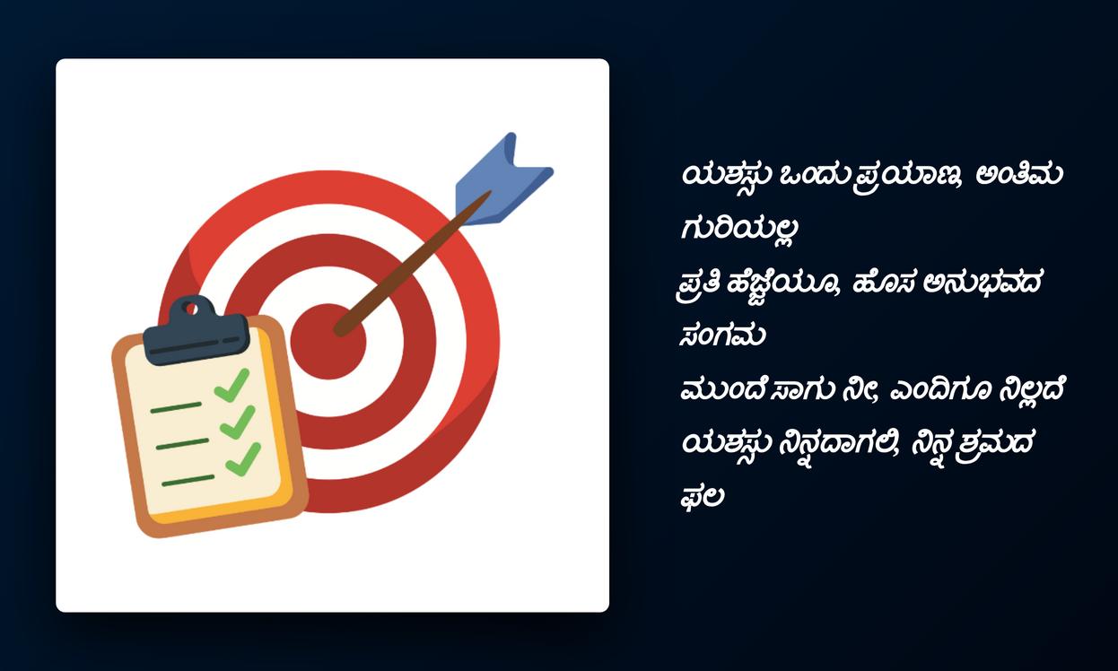 ఈ సక్సెస్ కోట్స్ మీ లోపల ఉన్న నిద్రాణమైన శక్తిని మేల్కొల్పి, లక్ష్యాలను చేరుకోవడానికి కావాల్సిన పట్టుదలను ఇస్తాయి. ప్రతి వ్యక్తి తమ జీవితంలో విజయం సాధించడానికి ఇతరుల నుంచి స్ఫూర్తిని పొందుతారు. అలాంటి స్ఫూర్తినిచ్చే కోట్స్ కన్నడలో ఉండటం ఒక గొప్ప బలం. మీ ప్రొఫైల్లో ఈ కోట్స్ ఉంచడం ద్వారా మీరు కేవలం మీ భావాలను పంచుకోవడమే కాకుండా, సమాజంలో సానుకూల వాతావరణాన్ని సృష్టించగలరు.